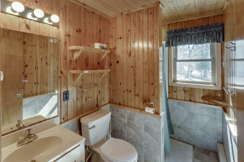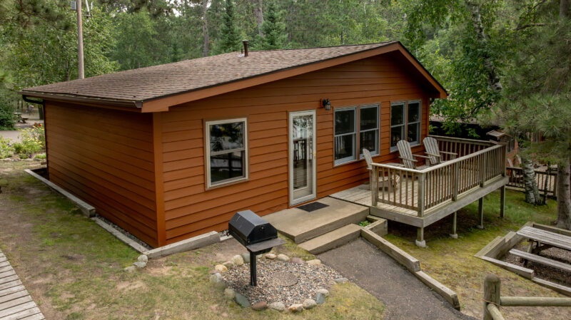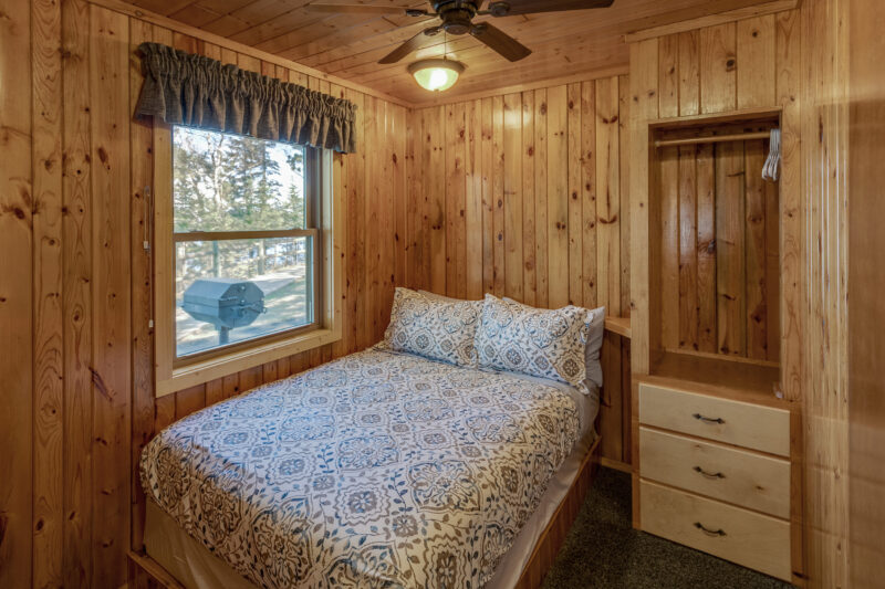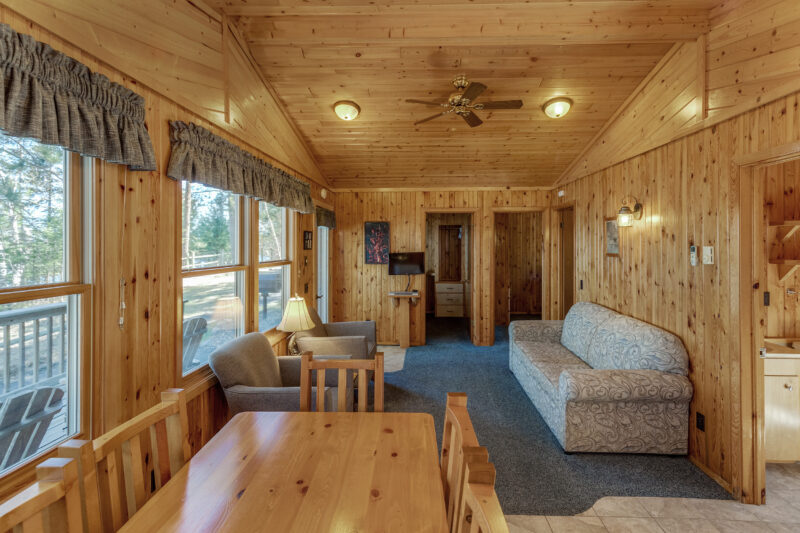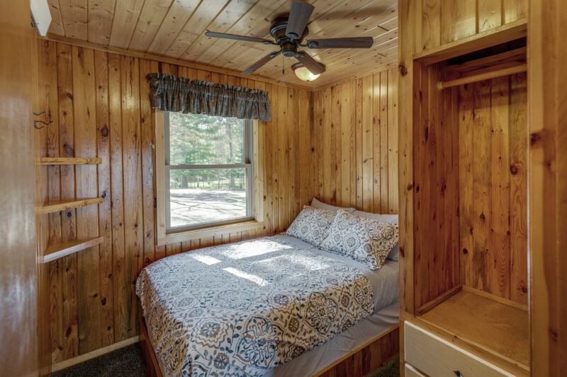 Fronted with over one hundred shrubs and flowering perennials, the location of this lakefront 3 bedroom cabin makes it a frequently requested unit. Deck time is spent in comfortable Adirondack chairs. The fresh knotty pine interior, vaulted living room and tasteful decor make being inside a pleasure in itself. One bedroom has a queen size bed, each of the other two has a double bed. Each bedroom has a built-in dresser. Electric heat and cooking. A/C. Refurbished in 2022.
