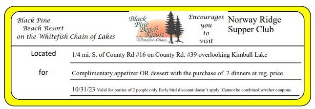 Norway Ridge Supper Club Complimentary appetizer OR dessert with the purchase of 2 dinners at reg. price Get Coupon