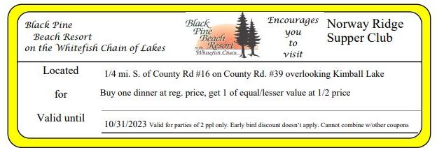 Norway Ridge Supper Club Buy one dinner at reg. price, get 1 of equal/lesser value at 1/2 price Get Coupon
